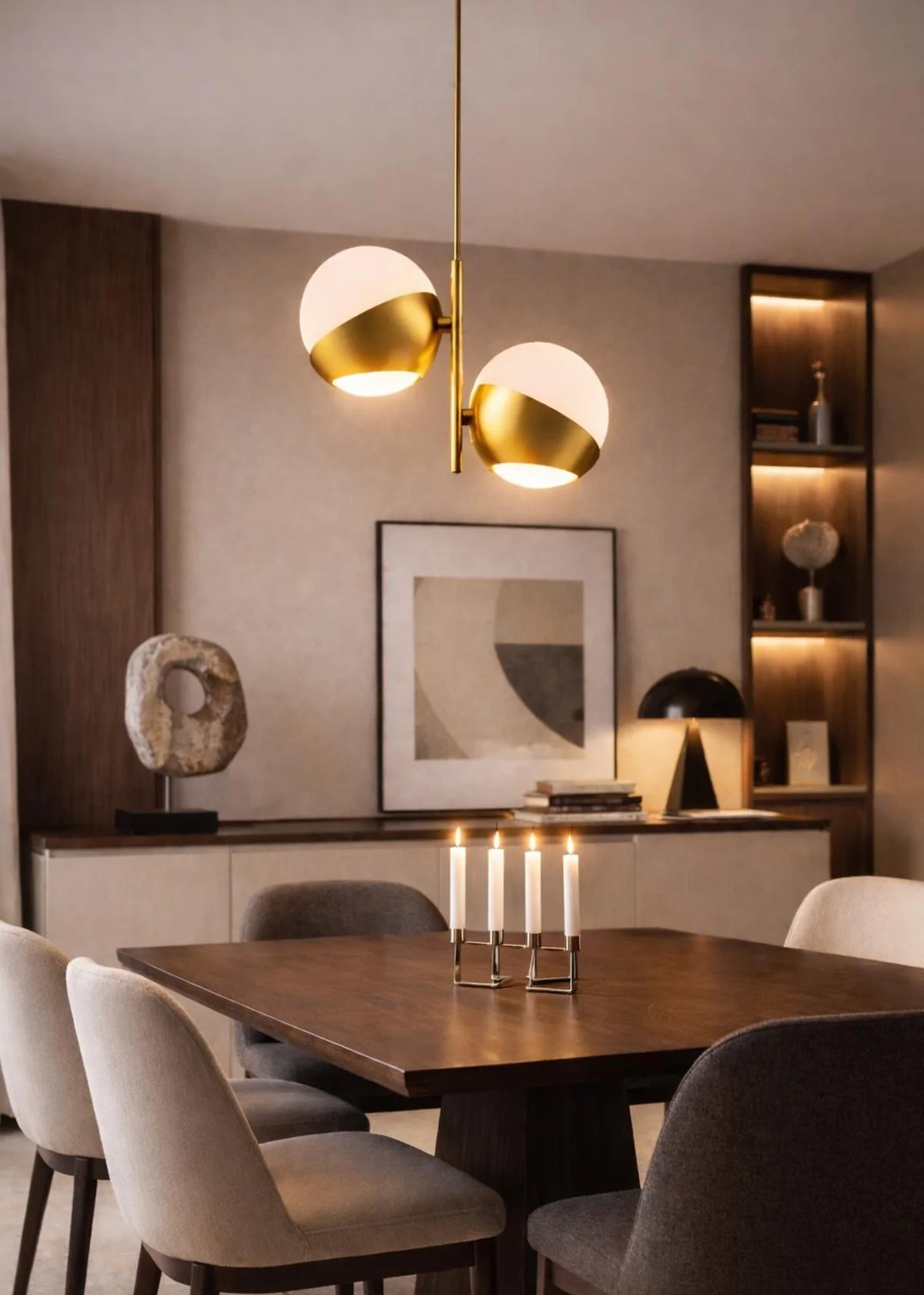 The two frosted glass spheres, enclosed by semi-circular matt black metal details, create a perfectly balanced play of contrasts and proportions.