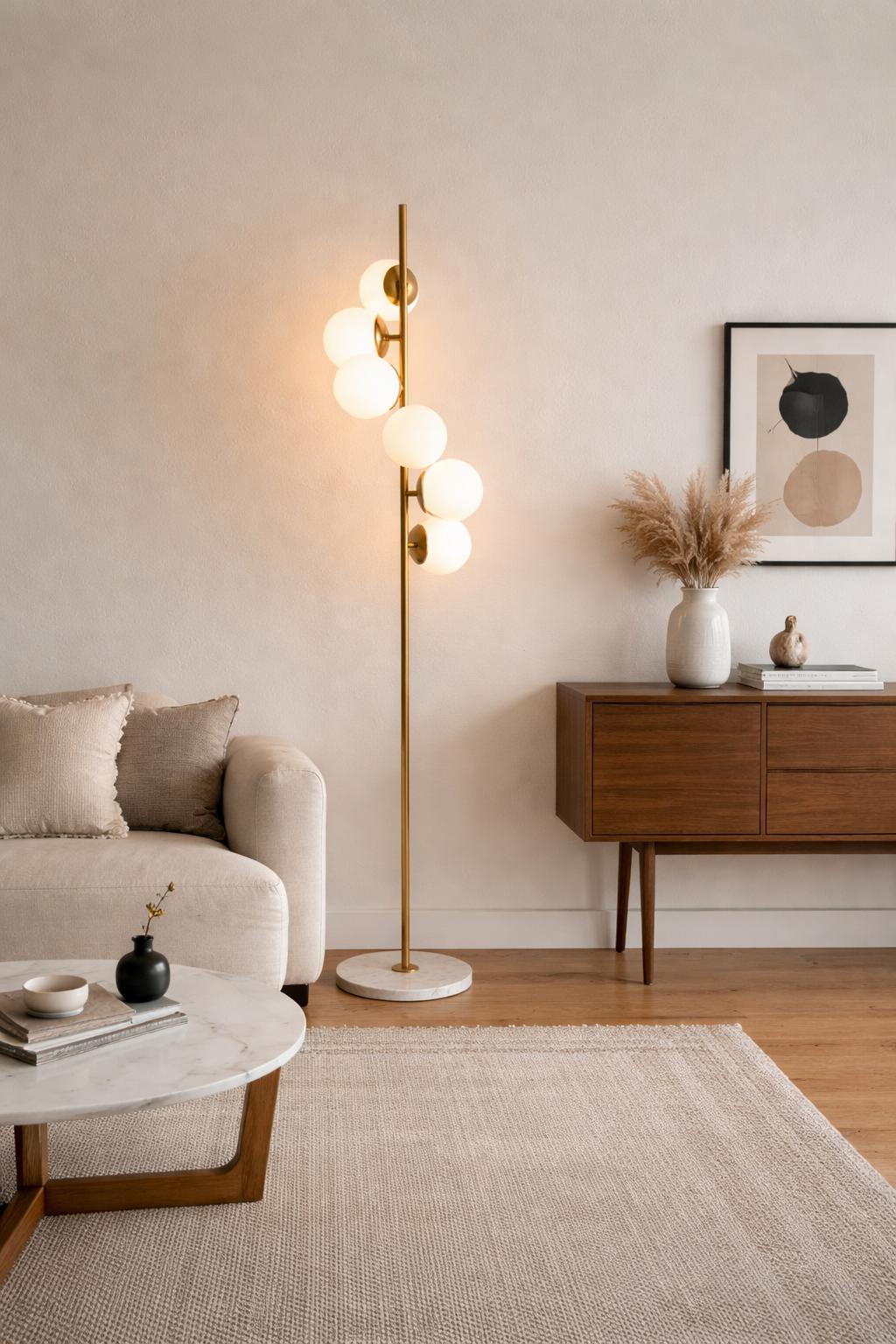 Its solid structure in high-quality brass and marble base guarantees durability and elegance. The five harmoniously arranged opal glass spheres give the lamp a graceful appearance and diffuse a gentle light. The combination of metal and glass creates a fascinating visual appeal that fits perfectly into any environment, from classic to modern.
