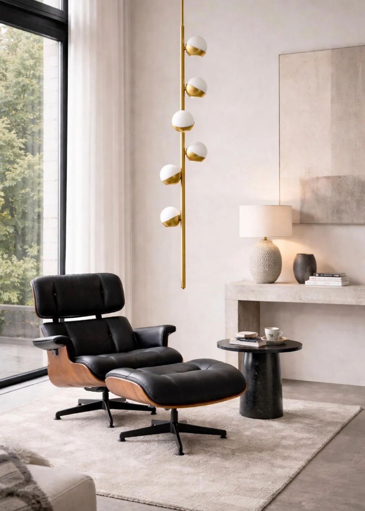The Crystal Tube pendant lamp is distinguished by its linear matt black metal structure, which supports a series of 5 frosted glass spheres wrapped in semicircular details with a strong character. The vertical arrangement of the elements creates a sense of lightness and movement, making it ideal for spaces with a contemporary and sophisticated character.