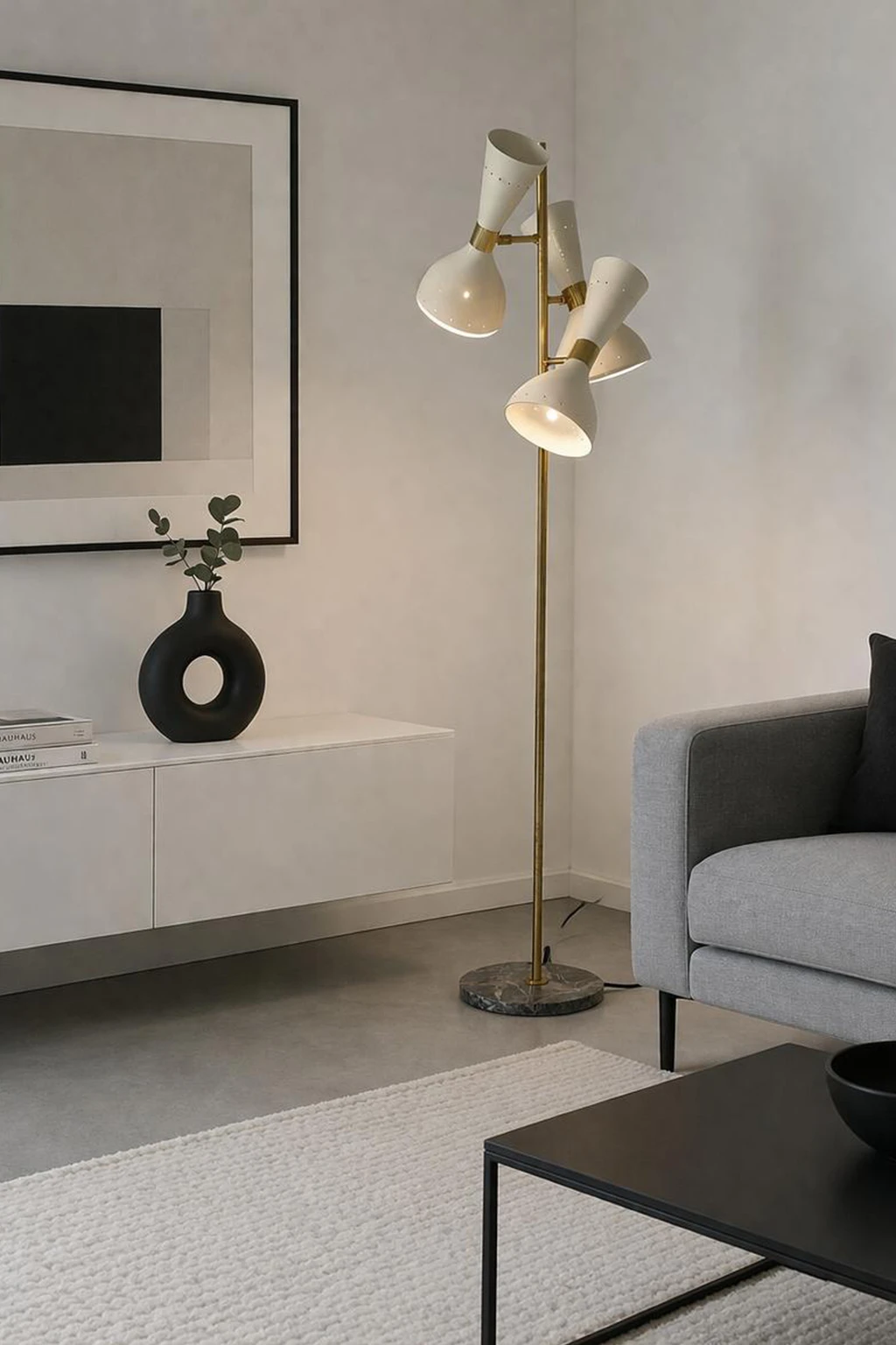 The slender silhouette integrates harmoniously into any decor, while the three double, adjustable light diffusers in a wide range of pastel shades or bright colors create unparalleled illumination. The elegant marble base not only ensures stability, but also gives the lamp a touch of luxury.