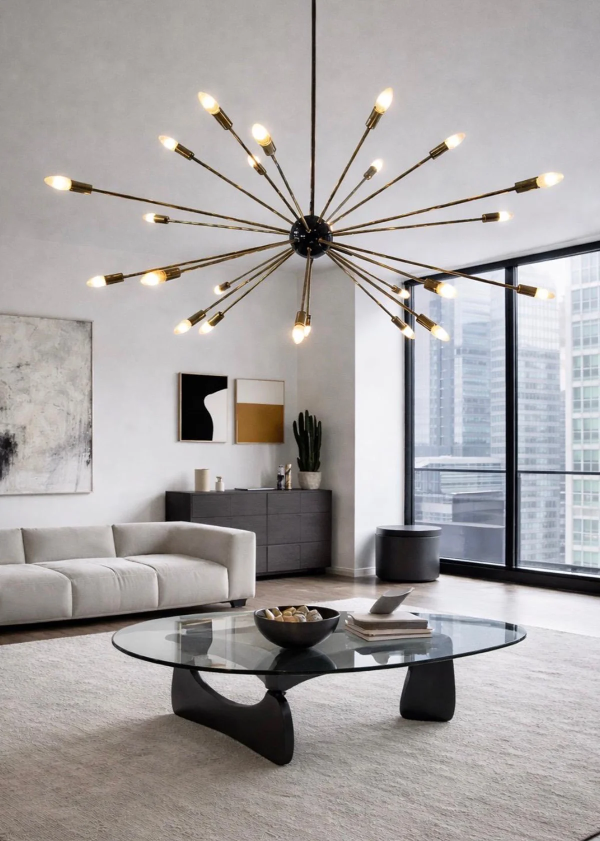 Immerse yourself in the timeless beauty of the SIRIO chandelier, inspired by the iconic era of design history. Handcrafted from high-quality brass, this lamp embodies a perfect harmony of form and function. The distinctive star silhouette creates a warm and welcoming light, creating an atmosphere of timeless elegance with its twenty-four light sources. The SIRIO CHANDELIER chandelier blends perfectly into a variety of interiors, giving every room a touch of timeless sophistication. A MUST HAVE for lovers of MID-CENTURY design who enjoy the luxury of perfect craftsmanship and the glamour of bygone eras.